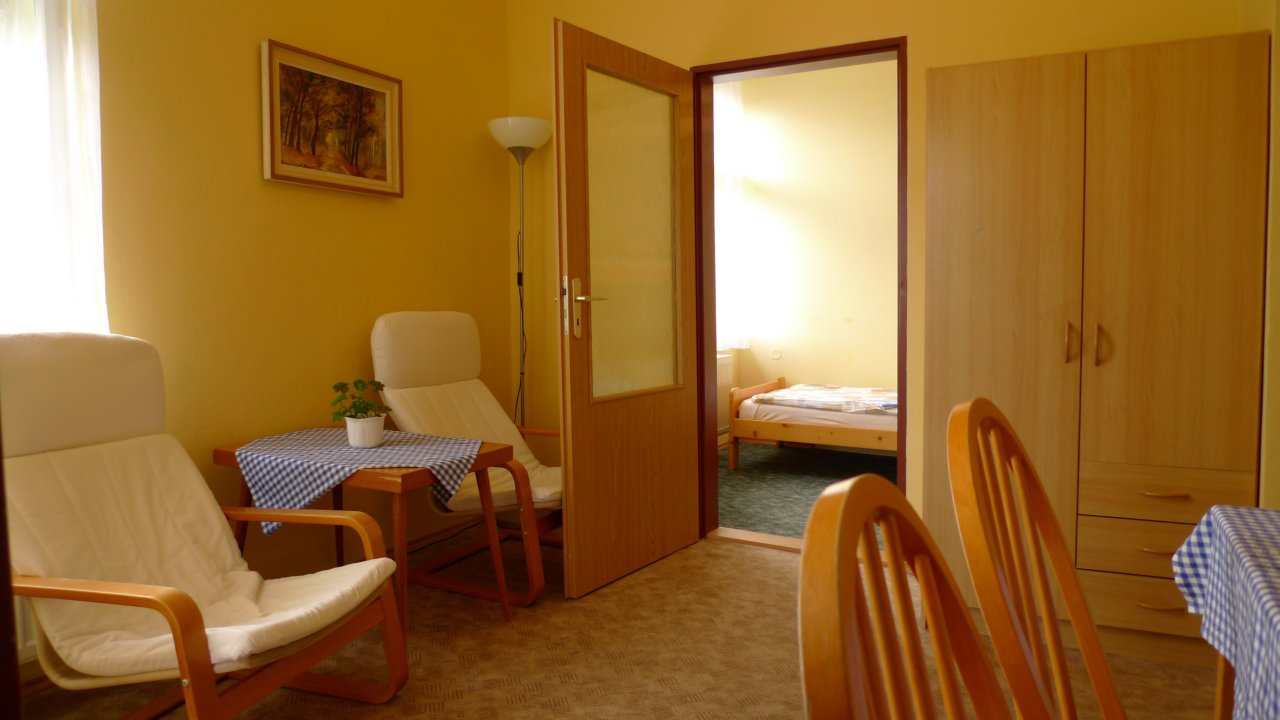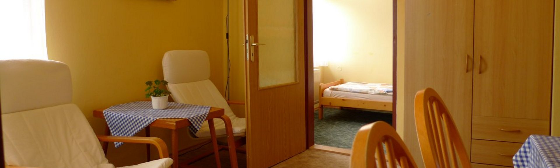 Apartmán má oddělenou ložnici, je standardně vybavený (k dispozici jsou dvě samostatné postele, jedna patrová postel, dvě křesla, stůl se židlemi, skříň). Součástí apartmánu je samostatná koupelna se sprchou a WC a samostatná kuchyňka.