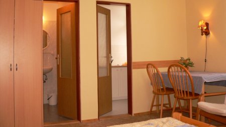 Apartmán je standardně vybavený (k dispozici jsou dvě samostatné postele, dvě křesla, stůl se židlemi, skříň). Součástí apartmánu je samostatná koupelna se sprchou a WC a samostatná kuchyňka.