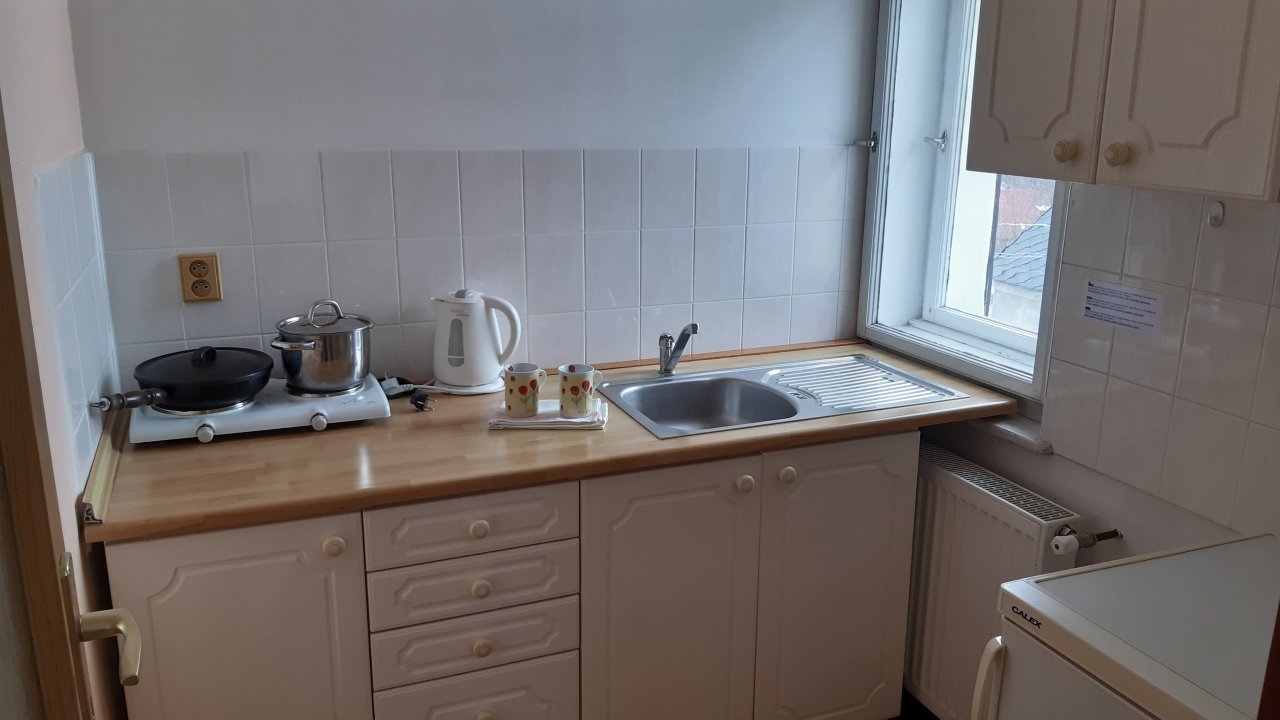 Kuchyňka je vybavená elektrickým dvouvařičem, rychlovarnou konvicí, ledničkou a nádobím (hrnce, talíře, příbory, skleničky, hrnky)