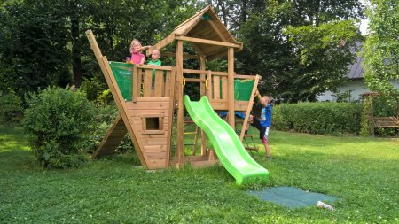 K penzionu patří velká zahrada s hřištěm pro míčové hry a herními prvky pro malé děti.