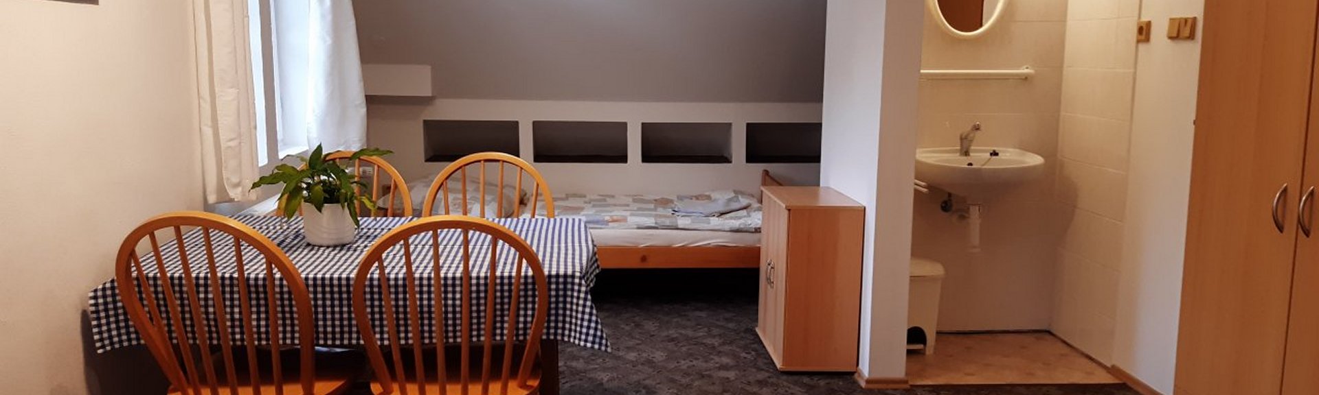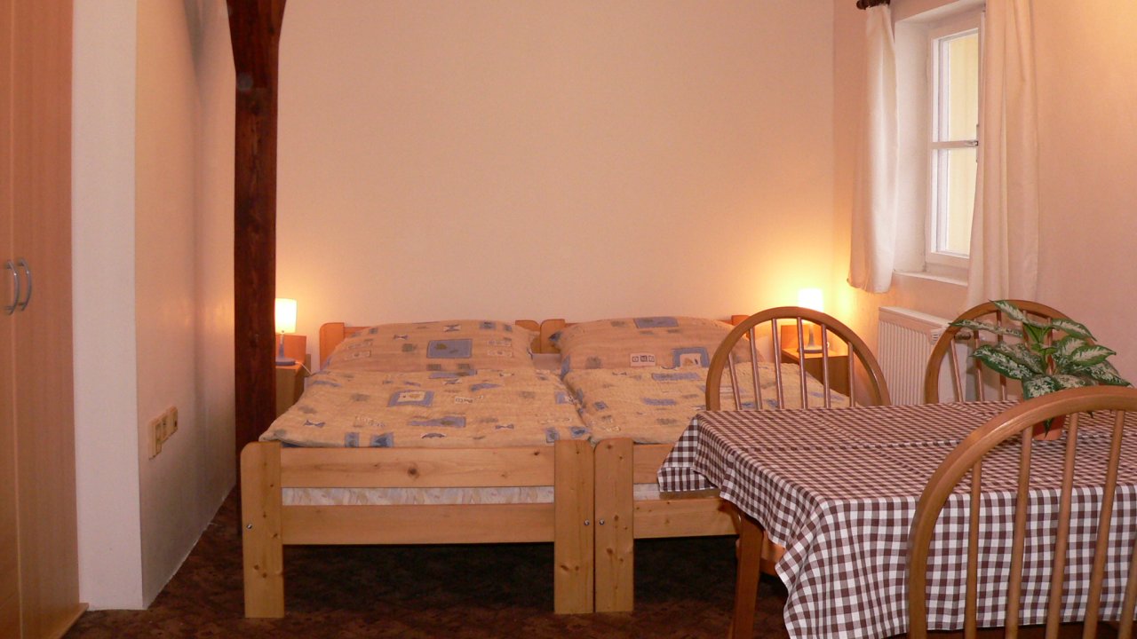 K dispozici jsou tři samostatné postele, stůl se židlemi, skříň, umyvadlo se zdrcadlem. Možnost přistýlky (za cenu za cenu 75% z ceny na osobu).